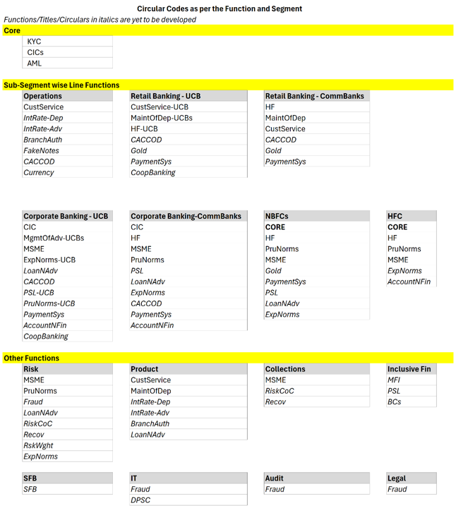 At their core, the Tests have question sets based on Regulatory Circulars (RBI, SEBI, IRDA, Govt., others) covering key business areas of banking, finance, insurance and compliance. These Tests can then be used to create workflows to ensure optimised L&D activities amongst your employees. And supported by TC’s large India-centric course catalogue and Network of Domain Experts, the Tests can be the foundation of blended programs. TC ensures that the question banks are periodically updated. The roadmap list of RBI Circulars is given below.